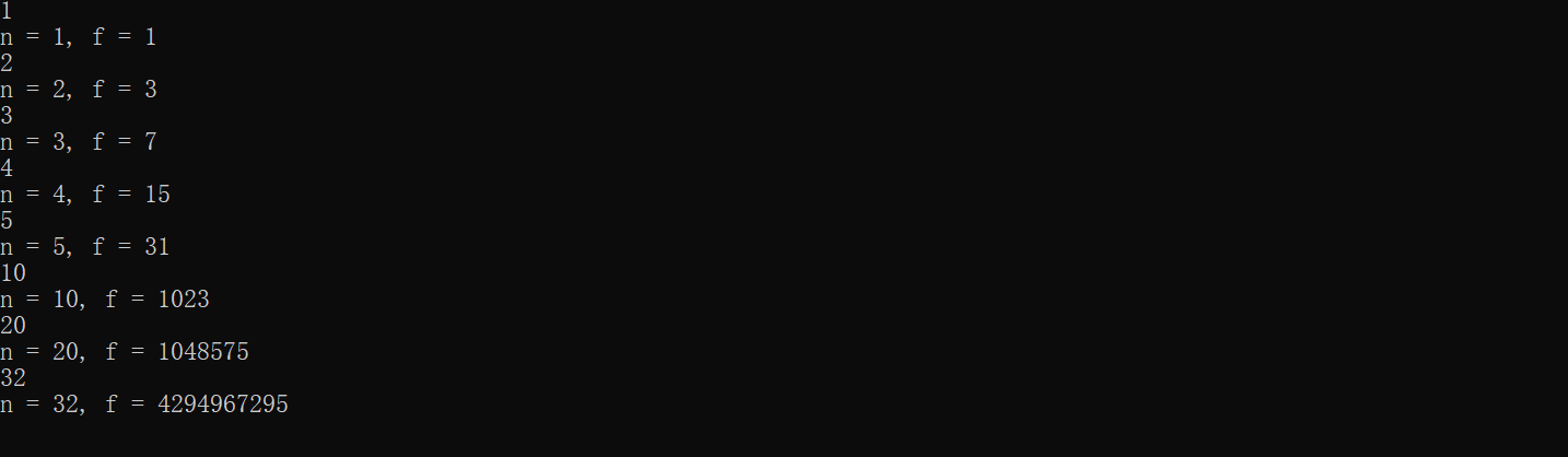 #include <stdio.h> long long func(int n); int main() { int n; long long f; while (scanf("%d", &n) != EOF) { f = func(n); printf("n = %d, f = %lld\n", n, f); } return 0; } long long func(int n) { long long f=0; if(n==1) return 1; else return func(n-1)*2+1; }