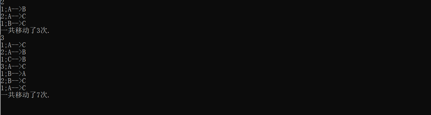 #include<stdio.h> #include<stdlib.h> void hanoi(unsigned int n,char from,char temp,char to); void moveplate(unsigned int n,char from,char to); int q=0; int main() { unsigned int n; while(scanf("%u",&n)!=EOF) { q=0; hanoi(n,'A','B','C'); printf("一共移动了%d次.\n",q); } system("pause"); return 0; } void hanoi(unsigned int n, char from, char temp,char to) { if(n==1) moveplate(n,from, to); else { hanoi(n-1,from, to, temp); moveplate(n,from, to); hanoi(n- 1,temp,from, to); } } void moveplate(unsigned int n, char from, char to) { printf("%u;%c-->%c\n",n,from,to); q++; }