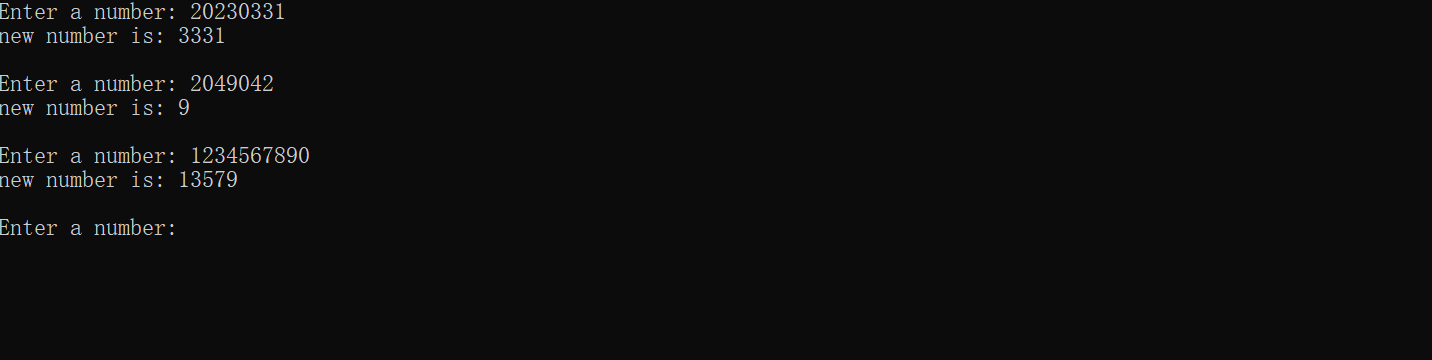#include <stdio.h> #include <math.h> long func(long s); // 函数声明 int main() { long s, t; printf("Enter a number: "); while (scanf("%ld", &s) != EOF) { t = func(s); // 函数调用 printf("new number is: %ld\n\n", t); printf("Enter a number: "); } return 0; } // 函数定义 long func(long s) { long sum=0; int b; int a=0; while(s) { b=s%10; if(b%2!=0) { sum+=pow(10,a)*b; a++; } s=s/10; } return sum; } // 待补足。。。
