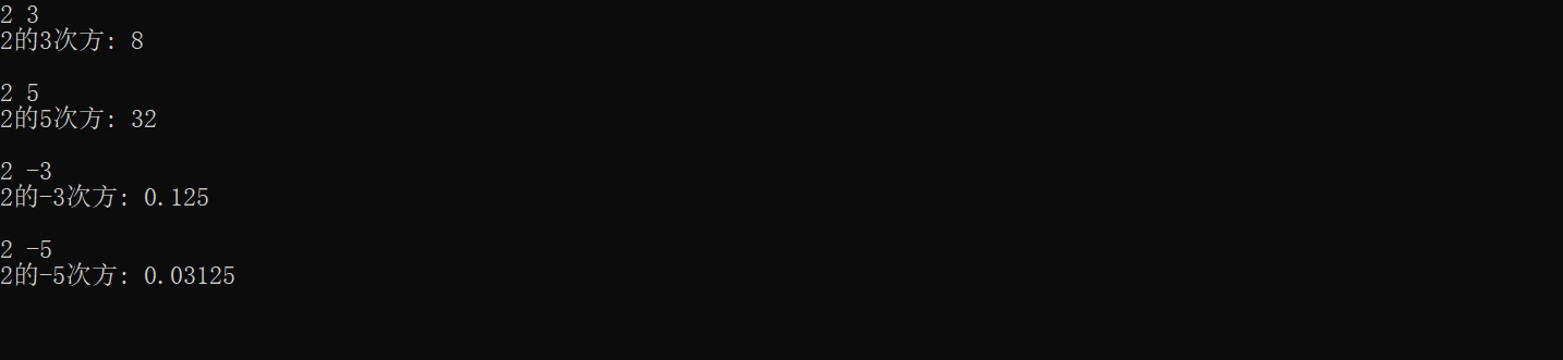 #include <stdio.h> double mypow(int x, int y); int main() { int x, y; double ans; while(scanf("%d%d", &x, &y) != EOF) { ans = mypow(x, y); printf("%d的%d次方: %g\n\n", x, y, ans); } return 0; } double mypow(int x, int y) { double sum=1; if(y>=0) for(int i=0;i<y;i++) { sum*=x; } else { for(int i=0;i>y;i--) { sum/=x; } } return sum; } double mypow(int x, int y) { double s=1; if(y>0) for(int i=0;i<y;i++) { s*=x; } else for(int i=0;i>y;i--) { s/=x; } return s; }