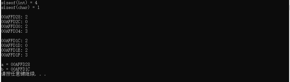 #include <stdio.h> #define N 4 #include<stdlib.h> int main() { int a[N] = {2, 0, 2, 3}; char b[N] = {'2', '0', '2', '3'}; int i; printf("sizeof(int) = %d\n", sizeof(int)); printf("sizeof(char) = %d\n", sizeof(char)); printf("\n"); // 输出int型数组a中每个元素的地址、值 for (i = 0; i < N; ++i) printf("%p: %d\n", &a[i], a[i]); printf("\n"); // 输出char型数组b中每个元素的地址、值 for (i = 0; i < N; ++i) printf("%p: %c\n", &b[i], b[i]); printf("\n"); // 输出数组名a和b对应的值 printf("a = %p\n", a); printf("b = %p\n", b); system("pause"); return 0; }
