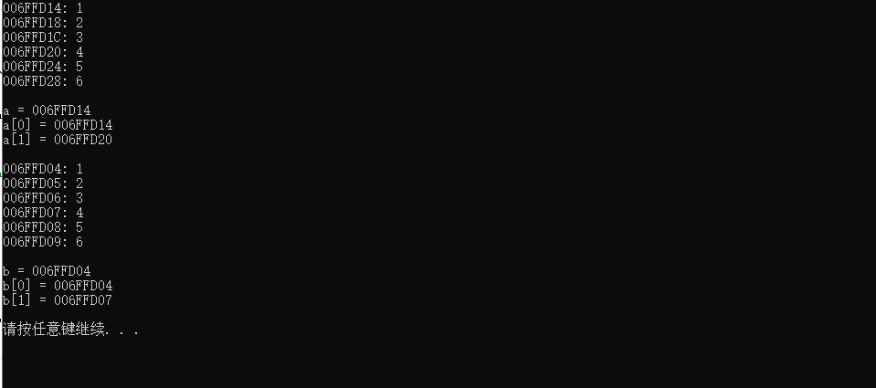 a[0]和a[1]不一样,差6是两组数据6个内存字节单位,b[0]和b[1]不一样,差3是3个元素占用的3个内存字节单位