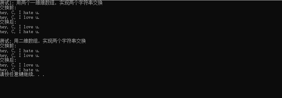 #include <stdio.h> #include <string.h> #include<stdlib.h> #define N 80 void swap_str(char s1[N], char s2[N]); void test1(); void test2(); int main() { printf("测试1: 用两个一维维数组,实现两个字符串交换\n"); test1(); printf("\n测试: 用二维数组,实现两个字符串交换\n"); test2(); system("pause"); return 0; } void test1() { char views1[N] = "hey, C, I hate u."; char views2[N] = "hey, C, I love u."; printf("交换前: \n"); puts(views1); puts(views2); swap_str(views1, views2); printf("交换后: \n"); puts(views1); puts(views2); } void test2() { char views[2][N] = {"hey, C, I hate u.", "hey, C, I love u."}; printf("交换前: \n"); puts(views[0]); puts(views[1]); swap_str(views[0], views[1]); printf("交换后: \n"); puts(views[0]); puts(views[1]); } void swap_str(char s1[N], char s2[N]) { char tmp[N]; strcpy(tmp, s1); strcpy(s1, s2); strcpy(s2, tmp); }