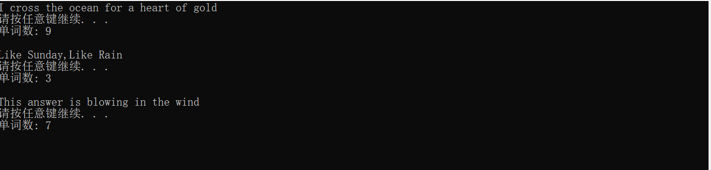 #include <stdio.h> #include<stdlib.h> #define N 80 int count(char x[]); int main() { char words[N+1]; int n; while(gets(words) != NULL) { n = count(words); printf("单词数: %d\n\n", n); } return 0; }