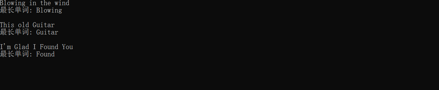 #include <stdio.h> #define N 1000 int main() { char line[N]; int word_len; // 记录当前单词长度 int max_len; // 记录最长单词长度 int end; // 记录最长单词结束位置 int i; while(gets(line) != NULL) { word_len = 0; max_len = 0; end = 0; i = 0; while(1) { // 跳过连续空格 while(line[i] == ' ') { word_len = 0; // 单词长度置0,为新单词统计做准备 i++; } // 在一个单词中,统计当前单词长度 while(line[i] != '\0' && line[i] != ' ') { word_len++; i++; } // 更新更长单词长度,并,记录最长单词结束位置 if(max_len < word_len) { max_len = word_len; end = i; // end保存的是单词结束的下一个坐标位置 } // 遍历到文本结束时,终止循环 if(line[i] == '\0') break; } // 输出最长单词 printf("最长单词: "); for(i = end - max_len; i < end; ++i) printf("%c", line[i]); printf("\n\n"); } return 0; }