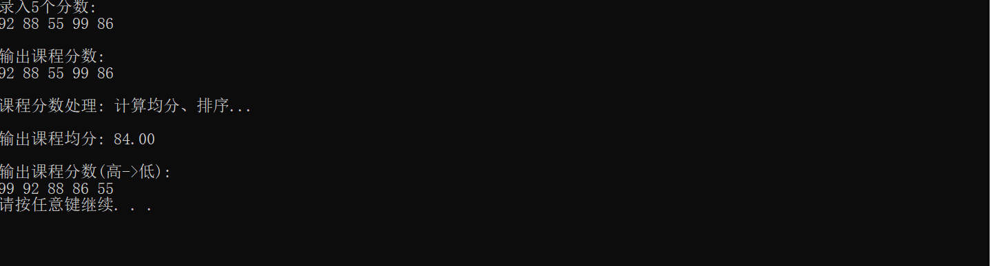 #include <stdio.h> #include<stdlib.h> #define N 5 // 函数声明 void input(int x[], int n); void output(int x[], int n); double average(int x[], int n); void bubble_sort(int x[], int n); int main() { int scores[N]; double ave; printf("录入%d个分数:\n", N); input(scores, N); printf("\n输出课程分数: \n"); output(scores, N); printf("\n课程分数处理: 计算均分、排序...\n"); ave = average(scores, N); bubble_sort(scores, N); printf("\n输出课程均分: %.2f\n", ave); printf("\n输出课程分数(高->低):\n"); output(scores, N); system("pause"); return 0; } // 函数定义 // 输入n个整数保存到整型数组x中 void input(int x[], int n) { int i; for(i = 0; i < n; ++i) scanf("%d", &x[i]); } // 输出整型数组x中n个元素 void output(int x[], int n) { int i; for(i = 0; i < n; ++i) printf("%d ", x[i]); printf("\n"); } double average(int x[], int n){ int i; double s=0; for(i=0;i<N;i++){ s=s+x[i]; } return s/N; } void bubble_sort(int x[], int n){ int i,j,t; for(i=0;i<N-1;i++) for(j=0;j<N-i-1;j++) if(x[j]<x[j+1]){ t=x[j]; x[j]=x[j+1]; x[j+1]=t;} }