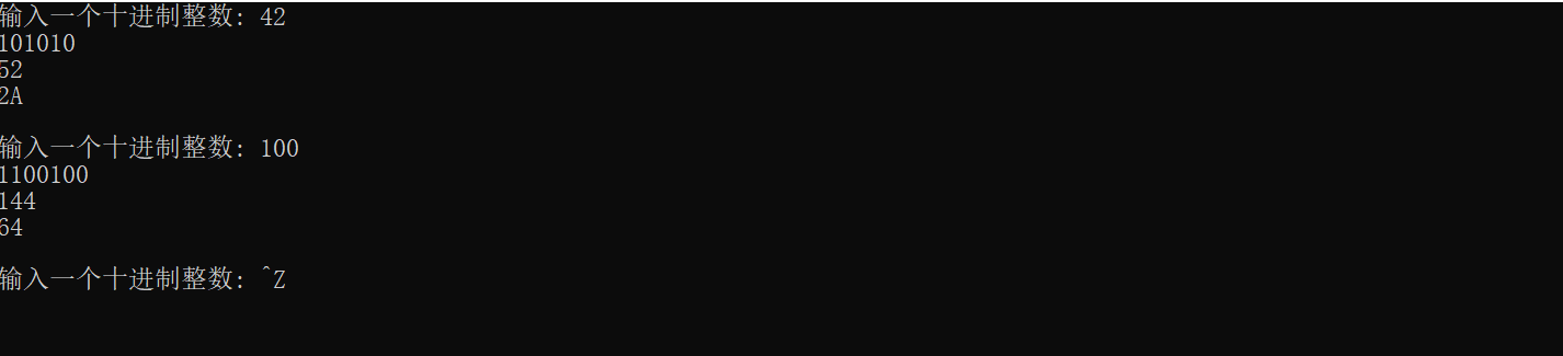 #include <stdio.h> #include<stdlib.h> #define N 100 void dec2n(int x, int n); // 函数声明 int main() { int x; printf("输入一个十进制整数: "); while(scanf("%d", &x) != EOF) { dec2n(x, 2); // 函数调用: 把x转换成二进制输出 dec2n(x, 8); // 函数调用: 把x转换成八进制输出 dec2n(x, 16); // 函数调用: 把x转换成十六进制输出 printf("\n输入一个十进制整数: "); } system("pause"); return 0; } void dec2n(int x, int n){ char num[N]; char str[N]="0123456789ABCDEF"; int i=0,j,t; while(x!=0){ t=x%n; x=x/n; num[i]=str[t]; i++; } j=i; for(i=j-1;i>=0;i--) printf("%c",num[i]); printf("\n"); }