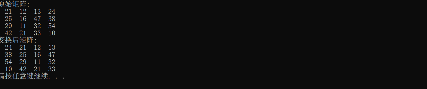 #include <stdio.h> #include<stdlib.h> #define N 100 #define M 4 void output(int x[][N], int n); // 函数声明 void rotate_to_right(int x[][N], int n); // 函数声明 int main() { int t[][N] = {{21, 12, 13, 24}, {25, 16, 47, 38}, {29, 11, 32, 54}, {42, 21, 33, 10}}; printf("原始矩阵:\n"); output(t, M); // 函数调用 rotate_to_right(t, M); // 函数调用 printf("变换后矩阵:\n"); output(t, M); // 函数调用 system("pause"); return 0; } // 函数定义 // 功能: 输出一个n*n的矩阵x void output(int x[][N], int n) { int i, j; for (i = 0; i < n; ++i) { for (j = 0; j < n; ++j) printf("%4d", x[i][j]); printf("\n"); } } void rotate_to_right(int x[][N], int n) { int i,j,t; for(i=0;i<n;i++) { t=x[i][n-1]; for(j=n-1;j>0;j--) { x[i][j]=x[i][j-1]; } x[i][0]=t; } }
