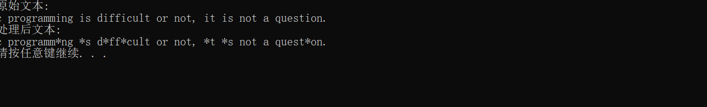 #include <stdio.h> #include<stdlib.h> #define N 80 void replace(char x[], char old_char, char new_char); // 函数声明 int main() { char text[N] = "c programming is difficult or not, it is not a question."; printf("原始文本: \n"); printf("%s\n", text); replace(text, 'i', '*'); // 函数调用 注意字符形参写法,单引号不能少 printf("处理后文本: \n"); printf("%s\n", text); system("pause"); return 0; } // 函数定义 void replace(char x[], char old_char, char new_char) { int i; for (i = 0; x[i] != '\0'; ++i) // 思考: '\0'是什么,为什么能作为循环结束条件 if (x[i] == old_char) x[i] = new_char; }