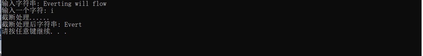 #include <stdio.h> #include<stdlib.h> #define N 80 int main() { char str[N], ch; int i; printf("输入字符串: "); gets(str); printf("输入一个字符: "); ch = getchar(); printf("截断处理......"); i = 0; while (str[i] != '\0') { if (str[i] == ch) { str[i+1]='\0'; break;} i++; } str[i] = '\0' ; printf("\n截断处理后字符串: %s\n", str); system("pause"); return 0; }