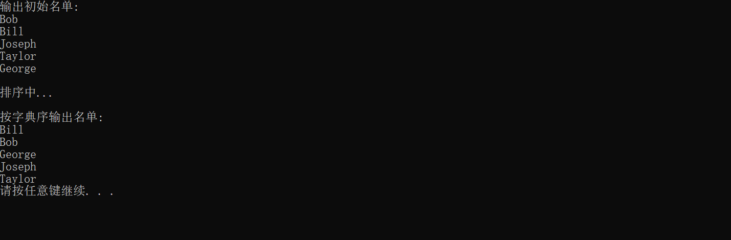 #include <stdio.h> #include <string.h> #include<stdlib.h> #define N 5 #define M 20 void bubble_sort(char str[][M], int n); // 函数声明 int main() { char name[][M] = {"Bob", "Bill", "Joseph", "Taylor", "George"}; int i; printf("输出初始名单:\n"); for (i = 0; i < N; i++) printf("%s\n", name[i]); printf("\n排序中...\n"); bubble_sort(name, N); // 函数调用 printf("\n按字典序输出名单:\n"); for (i = 0; i < N; i++) printf("%s\n", name[i]); system("pause"); return 0; } void bubble_sort(char str[][M], int n) { int i,j; char k[M]; for(i=0;i<5;i++) for(j=0;j<n-i-1;j++) if(strcmp(str[j],str[j+1])>0) { strcpy(k,str[j]); strcpy(str[j],str[j+1]); strcpy(str[j+1],k); } }