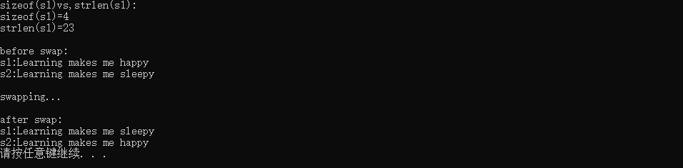 #include<stdio.h> #include<stdlib.h> #include<string.h> #define N 80 int main() { char s1[]="Learning makes me happy"; char s2[]="Learning makes me sleepy"; char tmp[N]; printf("sizeof(s1)vs,strlen(s1):\n"); printf("sizeof(s1)=%d\n",sizeof(s1)); printf("strlen(s1)=%d\n",strlen(s1)); printf("\nbefore swap:\n"); printf("s1:%s\n",s1); printf("s2:%s\n",s2); printf("\nswapping...\n"); strcpy(tmp,s1); strcpy(s1,s2); strcpy (s2,tmp); printf("\nafter swap:\n"); printf("s1:%s\n",s1); printf("s2:%s\n",s2); system("pause"); return 0; }