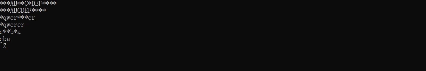 #include<stdio.h> #include<stdlib.h> #define N 80 void func(char *); int main() { char s[N]; while(scanf("%s",s)!=EOF) { func(s); puts(s); } system("pause"); return 0; } void func(char *str) { int i; char *p1,*p2,*p; p1=str; while(*p1=='*') p1++; p2=str; while(*p2) p2++; p2--; while(*p2=='*') p2--; p=str; i=0; while(p<p1) { str[i]=*p; p++; i++; } while(p<=p2) { if(*p!='*') { str[i]=*p; i++; } p++; } while(*p!='\0') { str[i]=*p; p++; i++; } str[i]='\0'; }