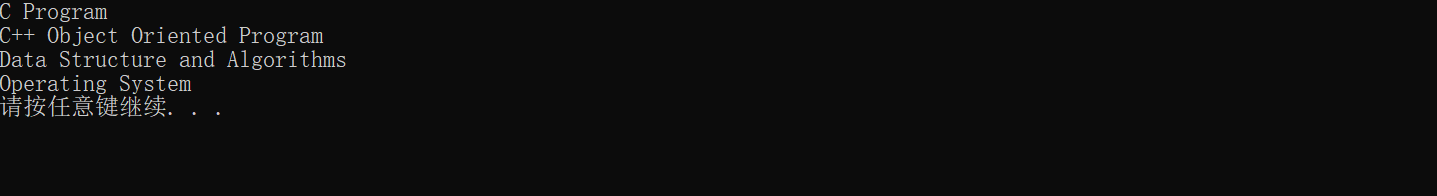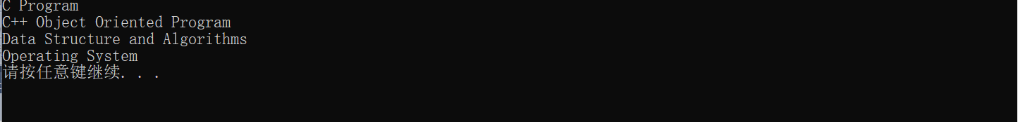 #include<stdio.h> #include<string.h> #include<stdlib.h> void sort(char *name[],int n); int main() { char *course[4]={"C Program", "C++ Object Oriented Program", "Operating System", "Data Structure and Algorithms"}; int i; sort(course,4); for(i=0;i<4;i++) printf("%s\n",course[i]); system("pause"); return 0; } void sort(char *name[],int n) { int i,j; char *tmp; for(i=0;i<n-1;++i) for(j=0;j<n-1-i;++j) if(strcmp(name[j],name[j+1])>0) { tmp=name[j]; name[j]=name[j+1]; name[j+1]=tmp; } }