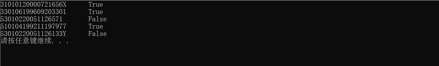 #include <stdio.h> #include <string.h> #include<stdlib.h> #define N 5 int check_id(char *str); int main() { char *pid[N] = {"31010120000721656X", "330106199609203301", "53010220051126571", "510104199211197977", "53010220051126133Y"}; int i; for (i = 0; i < N; ++i) if (check_id(pid[i])) printf("%s\tTrue\n", pid[i]); else printf("%s\tFalse\n", pid[i]); system("pause"); return 0; } int check_id(char *str) { if(strlen(str)!=18) return 0; else { char *p; p=str; while(*p>='0'&&*p<='9'&&*p!='\0'||*p=='X') p++; if(*p=='\0') return 1; else return 0; } }