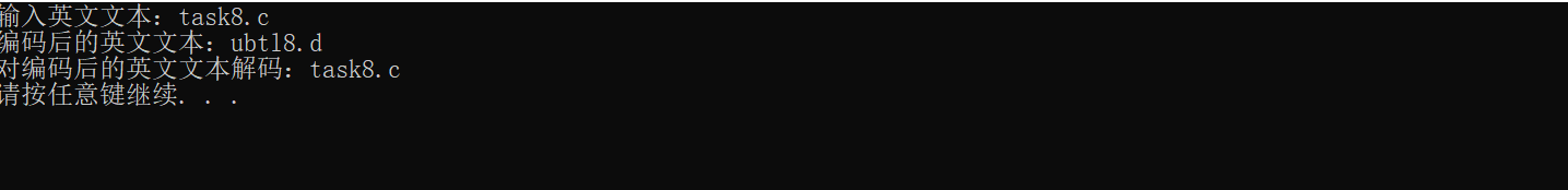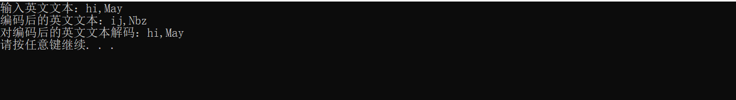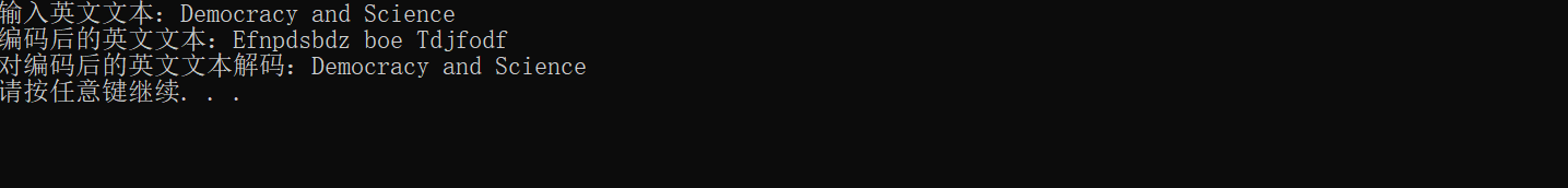 #include<stdio.h> #define N 80 #include<stdlib.h> void encoder(char *s); void decoder(char *s); int main() { char words[N]; printf("输入英文文本:"); gets(words); printf("编码后的英文文本:"); encoder(words); printf("%s\n",words); printf("对编码后的英文文本解码:"); decoder(words); printf("%s\n",words); system("pause"); return 0; } void encoder(char *s) { char *p; p=s; while(*p) { if(*p>='a'&&*p<='y'||*p>='A'&&*p<='Z') (*p)++; else if(*p=='z'||*p=='Z') *p=*p-25; p++; } } void decoder(char *s) { char *p; p=s; while(*p) { if(*p>='b'&&*p<='z'||*p>='B'&&*p<='Z') (*p)--; else if (*p=='A'||*p=='a') *p=*p+25; p++; } }