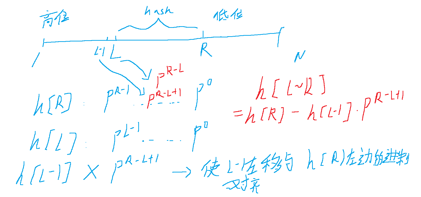h[i] = h[i-1] * P + str[i], p[i] = p[i-1] * P;