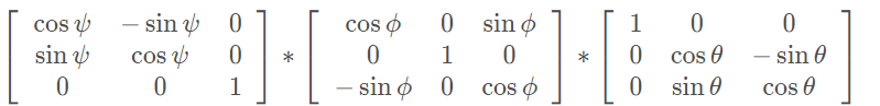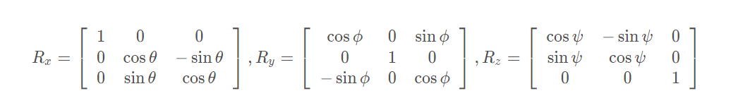例如:依次按照x-y-z轴的顺序进行分别旋转特定的角度 \(\psi\)、\(\phi\)、\(\theta\) 。旋转矩阵为: