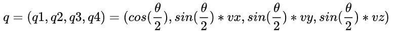 那么,它对应一个以向量\(v=(vx,vy,vz)\)为轴,旋转角度\(\theta\)的旋转操作(右手法则的旋转)。