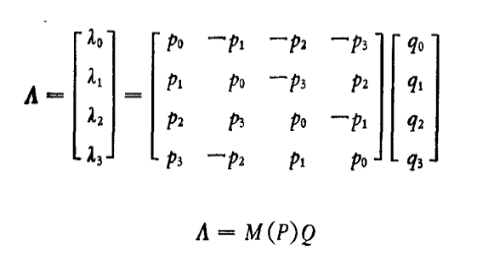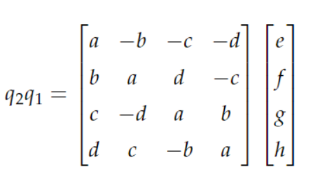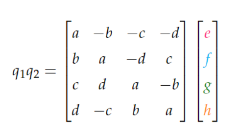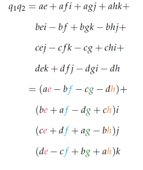 所以,如果有两个四元数\(q_1=a+bi+cj+dk\)和\(q_2=e+fi+gj+hk\)