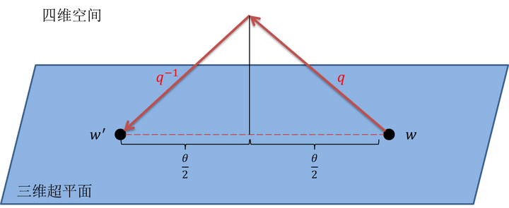 里面用的是\(\frac{\theta}{2}\)而不是\(\theta\)。这是因为\(q\)做的就是一个\(\frac{\theta}{2}\)的旋转,而\(q^{'}\)也做了一个\(\frac{\theta}{2}\)的旋转。我们进行了两次旋转,而不是一次,这两次旋转的结果是一个旋转角为\(\theta\)的旋转。