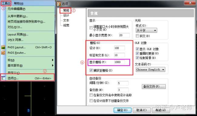 3) 设置显示栅格和设计栅格:设置PADS的显示栅格和设计栅格。