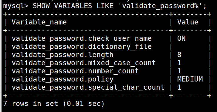 SHOW VARIABLES LIKE 'validate_password%';