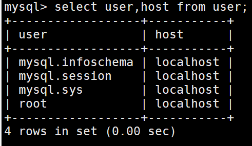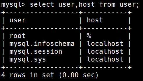 1 use mysql; 2 select user,host from user;