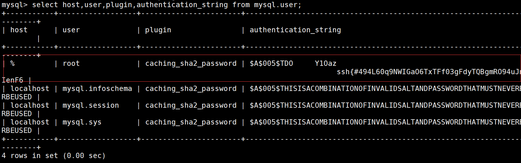 select host,user,plugin,authentication_string from mysql.user;