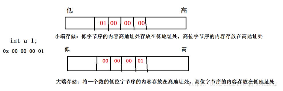 小端存储:把一个数的低位字节序内容放到低地址处,高位字节序的内容放在高地址处。