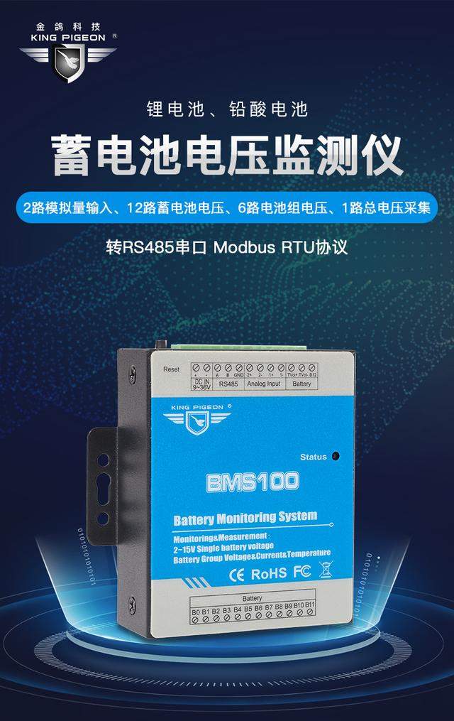 BMS100蓄电池监测模块,可以监测12路单体电池的电压,1路300VDC电压采集,2路4-20mA模拟量采集,除电池电压外还可以用模拟量采集传感器的数据,如电流变送器、温度变送器、压力变送器、气体变送器等。