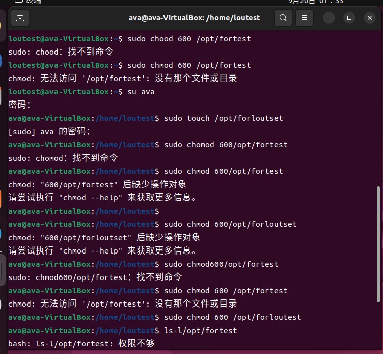 如图为第三章作业,首先创建loutest用户,然后使其加入sudo用户组,获取root权限,然后用touch 命令创建文件,最后设置成loutest用户可以读写