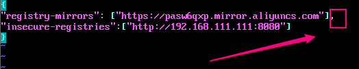 -->{"registry-mirrors": ["https://pasw6qxp.mirror.aliyuncs.com"] } #在/etc/docker/daemon.json文件下配置仓库地址,大括号注意回行