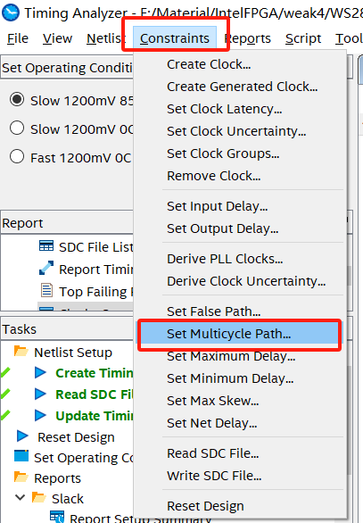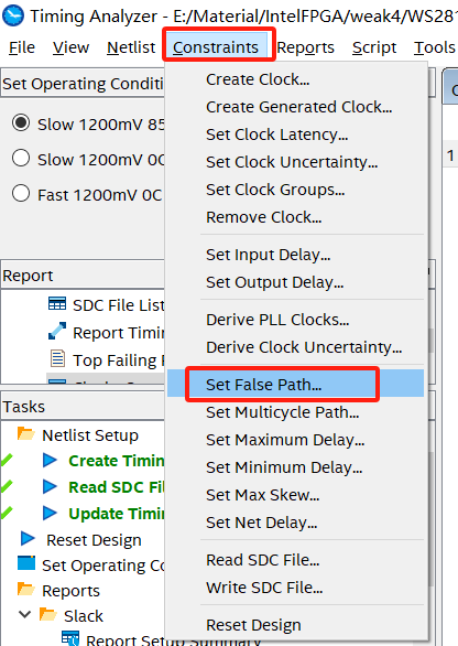 之后,就是按照昨天时序约束的步骤创建sdc约束文件,对时序分析过程中不满足的点通过“Constraints”进行相应的约束,其中各个不同约束的含义,在昨天的报告中均有提及。