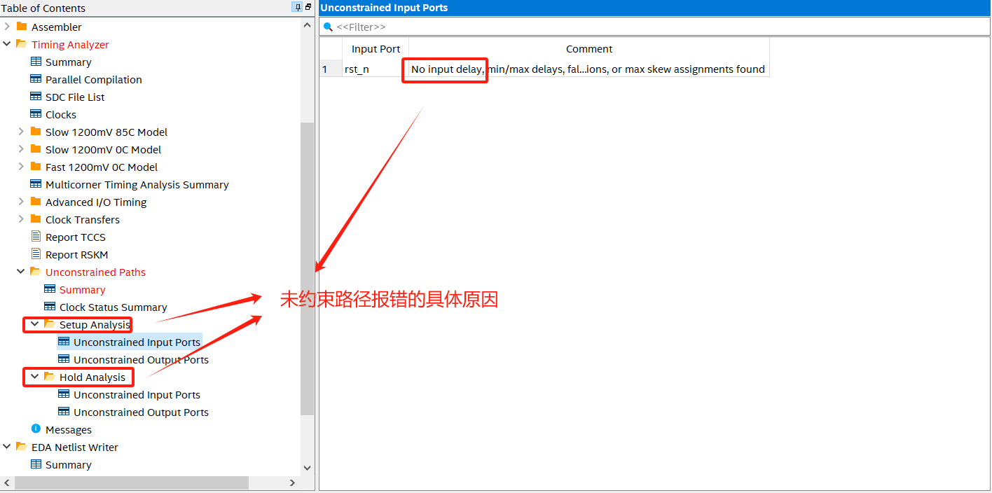 2)此处会指明未约束路径报错的具体原因,可以根据该原因在进行进一步时序约束,进行排错。