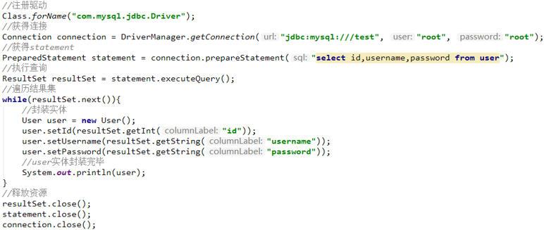 ③查询操作时,需要手动将结果集中的数据手动封装到实体中。插入操作时,需要手动将实体的数据设置到sql语句的占位符位置