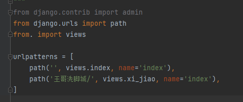 path('王哥洗脚城/',views.xi_jiao, name = 'index') 127.0.0.1 /王哥洗脚城 执行的是 views里面的 xi_jiao这个 函数,xi_jiao 是你自己写的函数