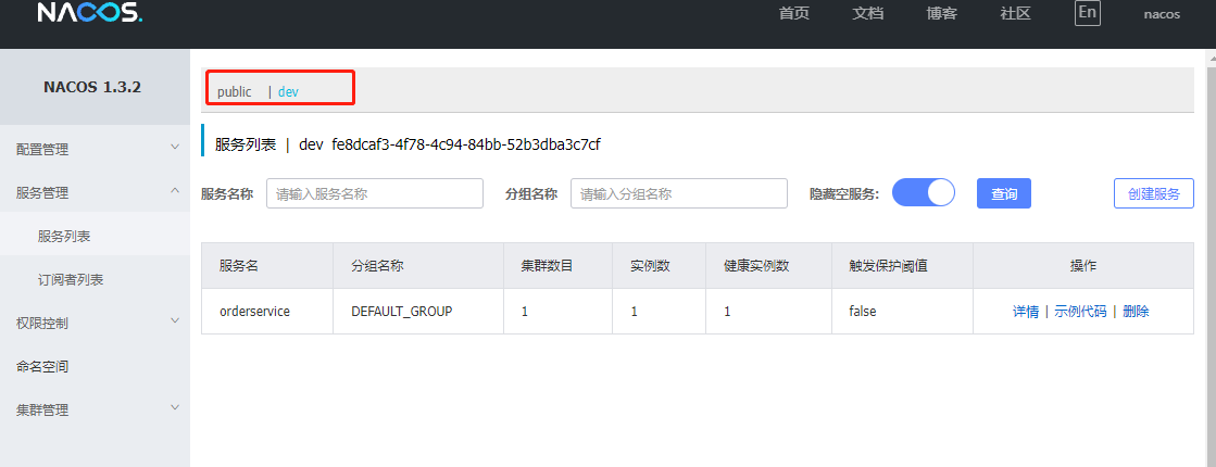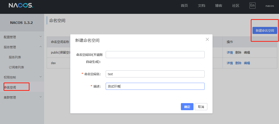 默认情况下,所有service、data、group都在同一个namespace,名为public,我们可以点击页面新增按钮,添加一个namespace: