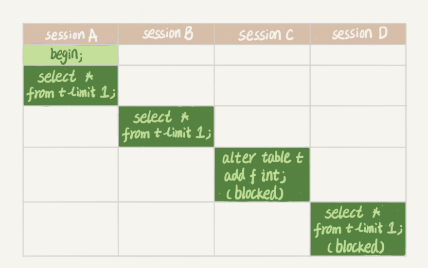 之后session C会被blocked,是因为session A的MDL读锁还没有释放,而session C需要MDL写锁,因此只能被阻塞。