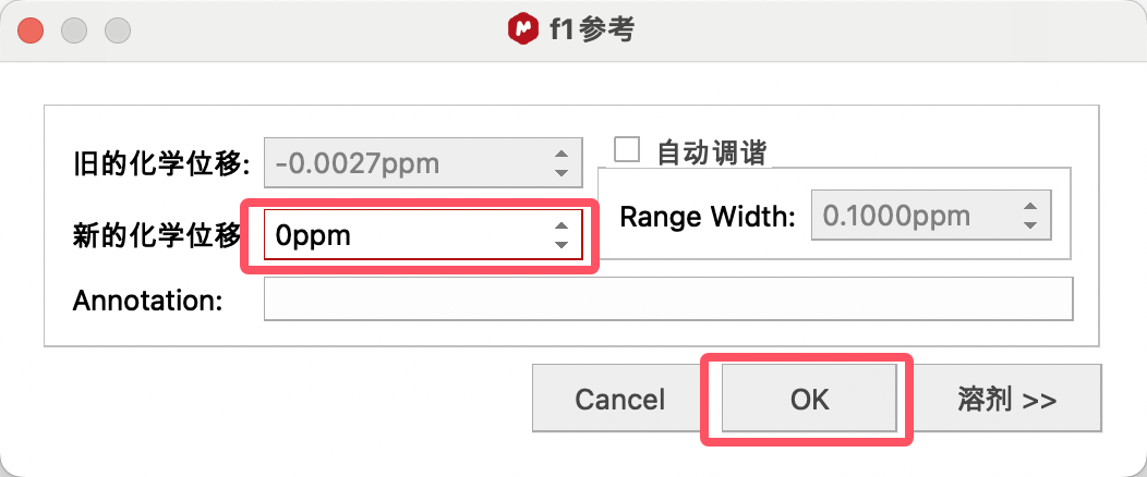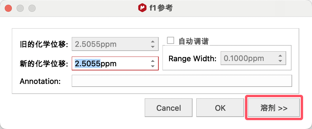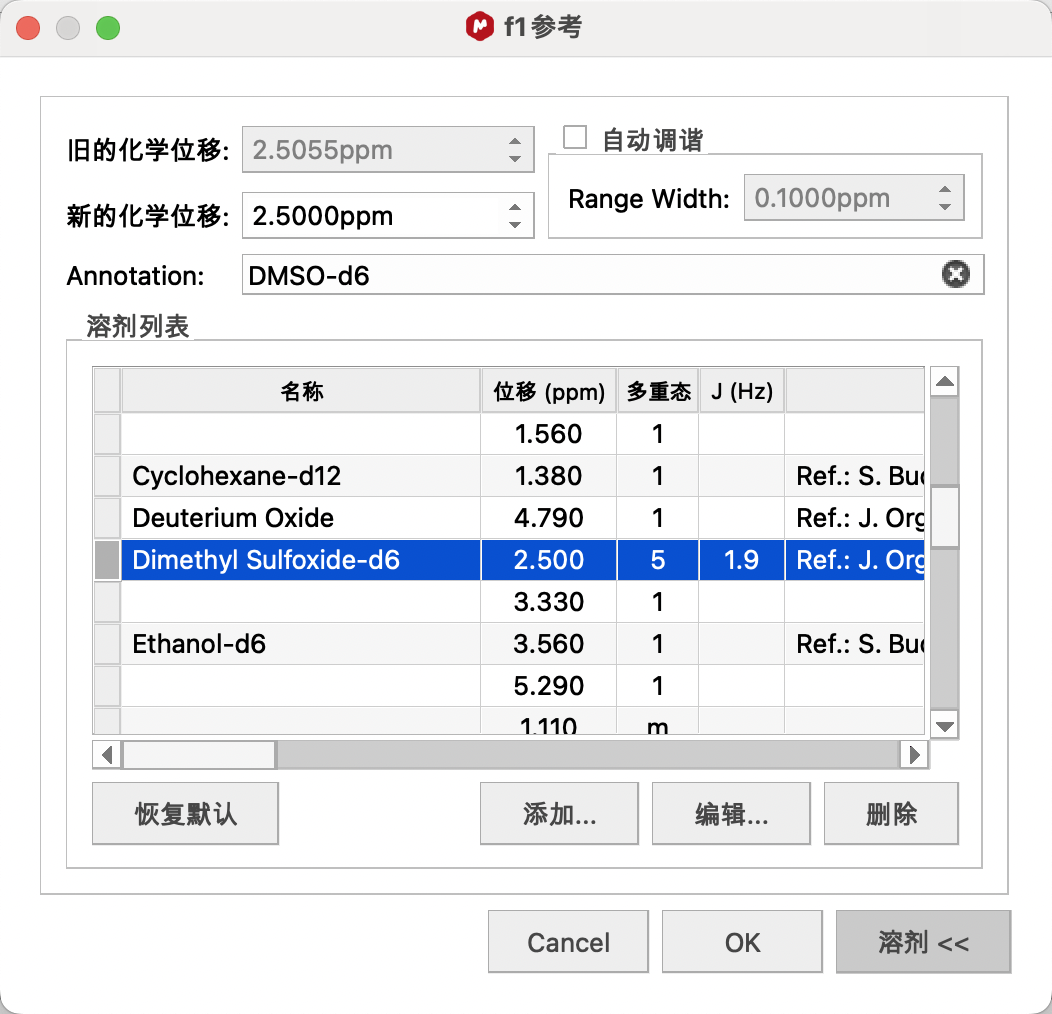 比如,要使用DMSO进行定标,选择DMSO的大致信号点(2.5ppm附近),点击修正窗口中的Solvents(溶剂),在其中找到DMSO的标准唯一,单击,点击OK进行定标。