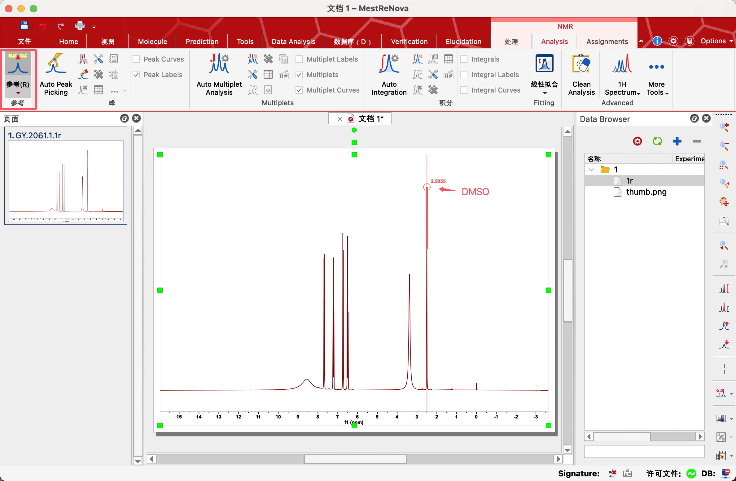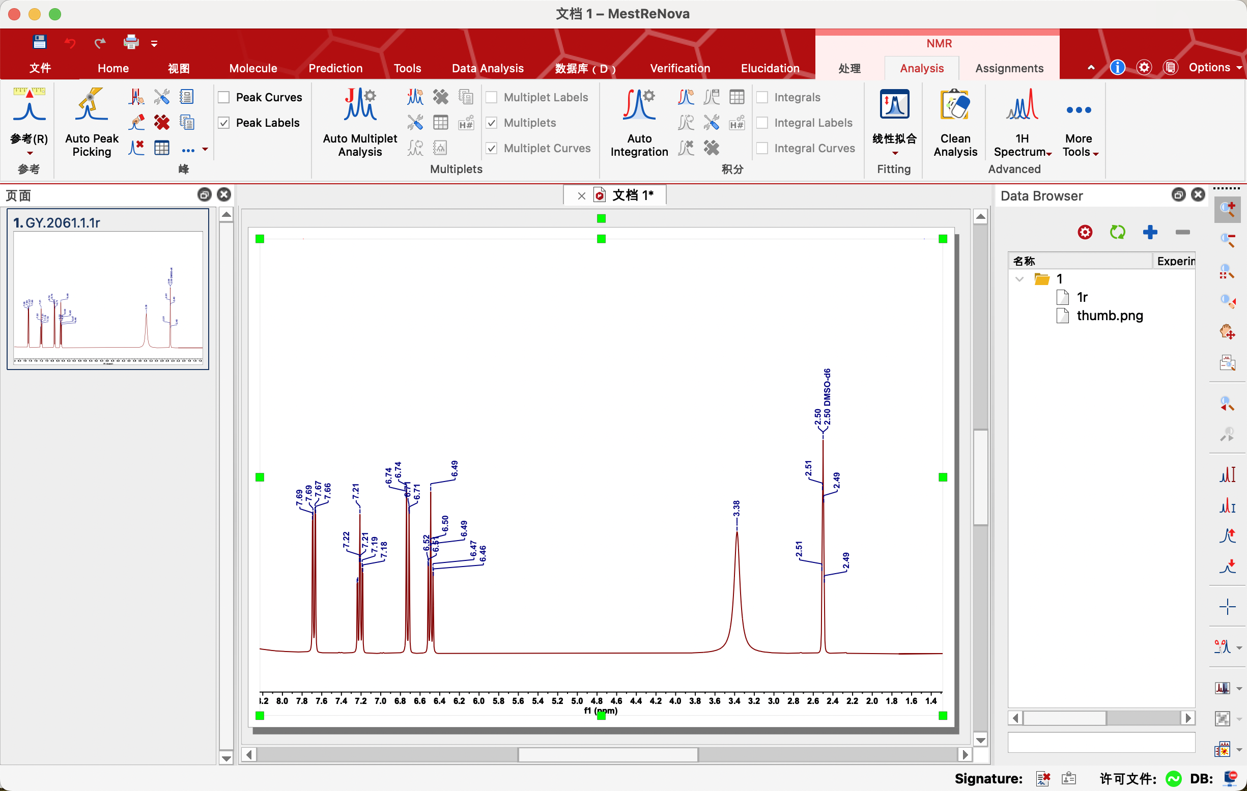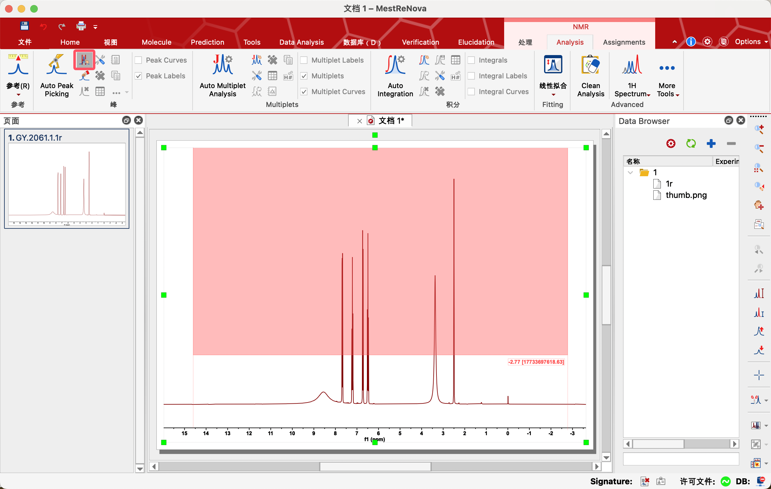 点击Auto Multiplet Analysis,自动对每一个信号进行多重峰分析(排除水和溶剂峰信号)。