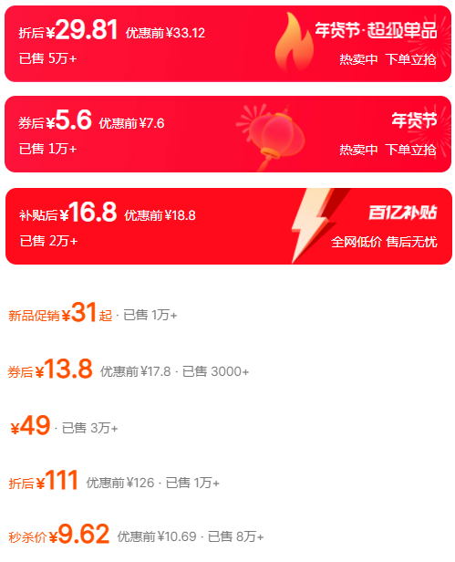 1、首先商品价格,我们发现不同的商品参加活动不一,导致商品价格样式有多种如下