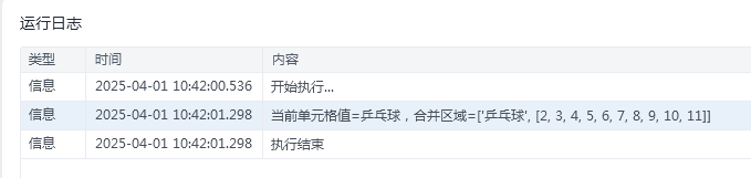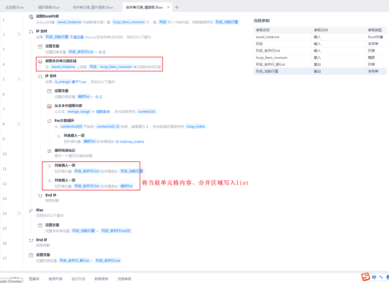 比如给这个子流程传参B2单元格,那么会输出['乒乓球', [2, 3, 4, 5, 6, 7, 8, 9, 10, 11]],代表B2-B11都是合并区间且其值=乒乓球