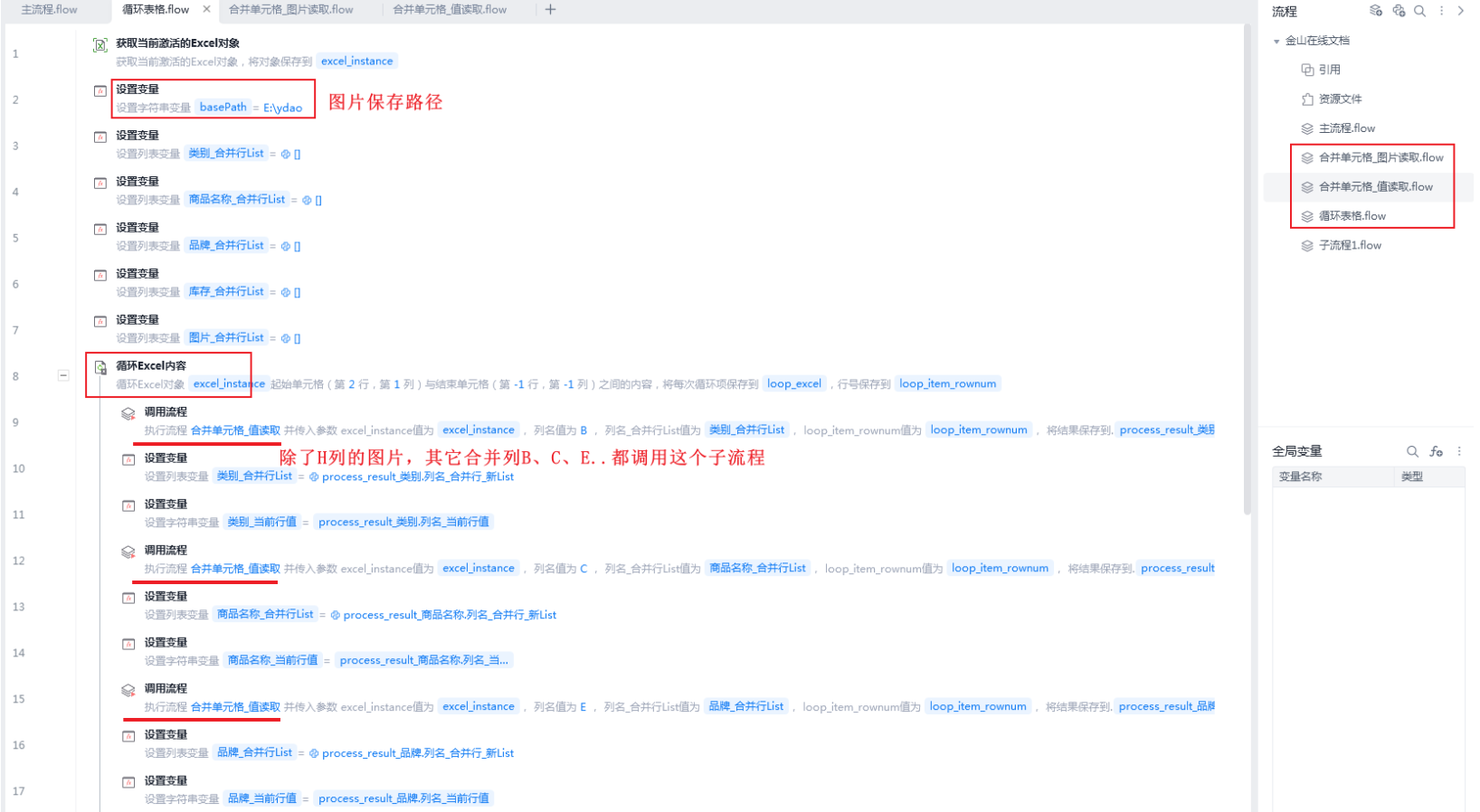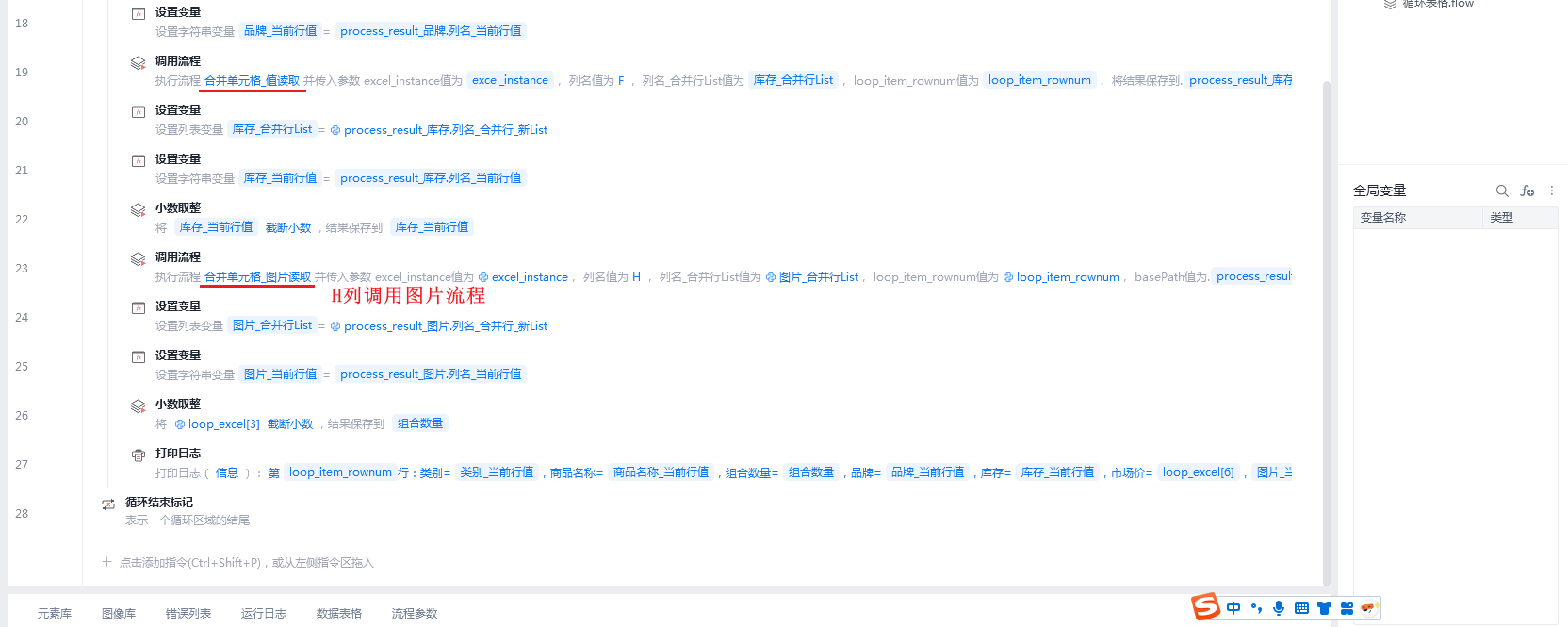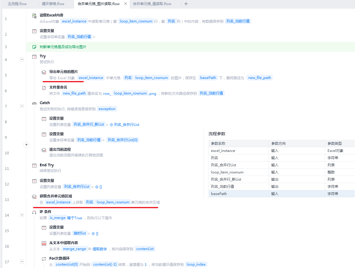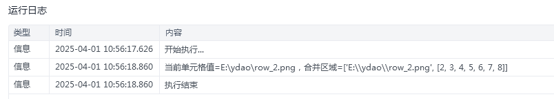 比如给这个子流程传参H2单元格,那么会输出['E:\\ydao\\row_2.png', [2, 3, 4, 5, 6, 7, 8]],代表H2-B8都是合并区间且其图片为E:\\ydao\\row_2.png