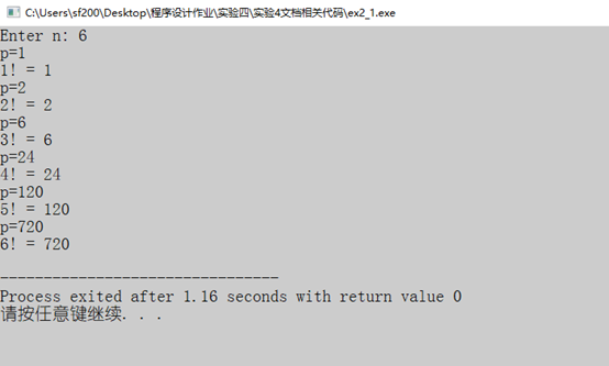 // 利用局部static变量计算阶乘 #include <stdio.h> long long fac(int n); // 函数声明 int main() { int i,n; printf("Enter n: "); scanf("%d", &n); for(i=1; i<=n; ++i) printf("%d! = %lld\n", i, fac(i)); return 0; } // 函数定义 long long fac(int n) { static long long p = 1; p = p*n; printf("p=%lld\n",p); return p; }