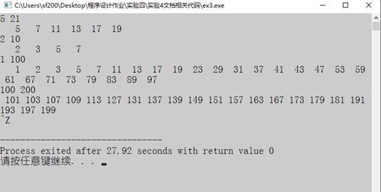 #include <stdio.h> #define N 1000 int fun(int n,int m,int bb[N]) { int i,j,k=0,flag; for(j=n;j<=m;j++) { flag=1; for(i=2;i<j;i++) if(j%i==0) { flag=0; break; } if(flag==1) bb[k++]=j; } return k; } int main(){ int n=0,m=0,i,k,bb[N]; while(scanf("%d",&n)!=EOF){ scanf("%d",&m); for(i=0;i<m-n;i++) bb[i]=0; k=fun(n,m,bb); for(i=0;i<k;i++) printf("%4d",bb[i]); printf("\n"); } return 0; }