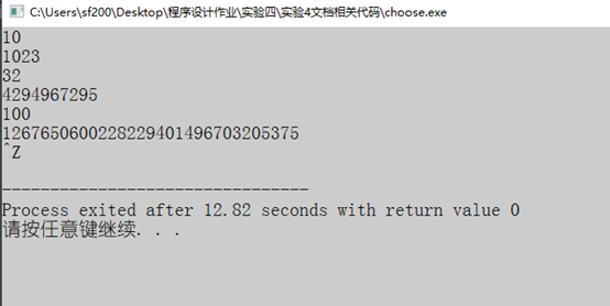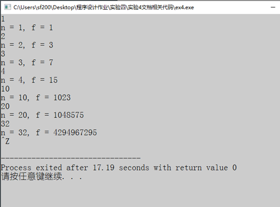 #include <stdio.h> long long fun(int n); // 函数声明 int main() { int n; long long f; while(scanf("%d", &n) != EOF) { f = fun(n); // 函数调用 printf("n = %d, f = %lld\n", n, --f); } return 0; } // 函数定义 long long fun(int n){ long long sum=2; if(n>1){ sum*=fun(--n); } return sum; }
