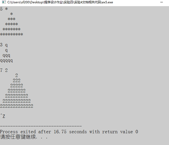 #include <stdio.h> void draw(int n, char symbol); // 函数声明 #include <stdio.h> int main() { int n; char symbol; while(scanf("%d %c", &n, &symbol) != EOF) { draw(n, symbol); // 函数调用 printf("\n"); } return 0; } // 函数定义 void draw(int n,char symbol){ int count=n-1; for(int i=1;i<=n;i++){ for(int k=0;k<count;k++){ printf(" "); } count--; for(int j=0;j<2*i-1;j++){ printf("%c",symbol); } printf("\n"); } }