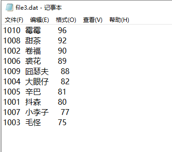 #include<stdio.h> #include<stdlib.h> #define N 10 typedef struct student { int num; char name[20]; int score; }STU; int main(){ FILE *fin; STU st[N]; fin = fopen("file4.dat", "rb"); fread(st,sizeof(STU),10,fin); fclose(fin); for(int i=0; i<N; i++) printf("%-6d%-10s%3d\n", st[i].num, st[i].name, st[i].score); return 0; }