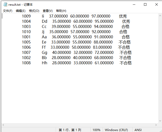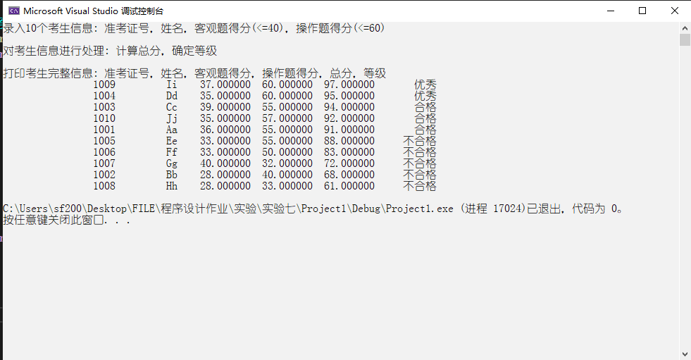 #include <stdio.h> #include <string.h> #define _CRT_SECURE_NO_DEPRECATE #pragma warning(disable:4996) const int N = 10; // 定义结构体类型struct student,并定义其别名为STU typedef struct student { long int id; char name[20]; float objective; /*客观题得分*/ float subjective; /*操作题得分*/ float sum; char level[10]; }STU; // 函数声明 void input(STU s[], int n); void output(STU s[], int n); void process(STU s[], int n); int main() { STU stu[N]; printf("录入%d个考生信息: 准考证号,姓名,客观题得分(<=40),操作题得分(<=60)\n", N); input(stu, N); printf("\n对考生信息进行处理: 计算总分,确定等级\n"); process(stu, N); printf("\n打印考生完整信息: 准考证号,姓名,客观题得分,操作题得分,总分,等级\n"); output(stu, N); return 0; } // 从文本文件examinee.txt读入考生信息:准考证号,姓名,客观题得分,操作题得分 void input(STU s[], int n) { FILE* fp; fp = fopen("C:\\Users\\sf200\\Desktop\\FILE\\程序设计作业\\实验\\实验七\\Project1\\Project1\\examinee.txt", "r"); for(int i=0;i<n;i++) fscanf(fp, "%ld %s %f %f", &s[i].id, s[i].name, &s[i].objective, &s[i].subjective); fclose(fp); } // 输出考生完整信息: 准考证号,姓名,客观题得分,操作题得分,总分,等级 // 不仅输出到屏幕上,还写到文本文件result.txt中 void output(STU s[], int n) { FILE* fin; fin = fopen("C:\\Users\\sf200\\Desktop\\FILE\\程序设计作业\\实验\\实验七\\Project1\\Project1\\result.txt","w"); for (int i = 0; i < n; i++) { printf("%20ld %10s %12f %10f %10f %10s\n", s[i].id, s[i].name, s[i].objective, s[i].subjective, s[i].sum, s[i].level); fprintf(fin,"%20ld %10s %12f %10f %10f %10s\n", s[i].id, s[i].name, s[i].objective, s[i].subjective, s[i].sum, s[i].level); } fclose(fin); } // 对考生信息进行处理:计算总分,排序,确定等级 void process(STU s[], int n) { for (int i = 0; i < n; i++) { s[i].sum = s[i].objective + s[i].subjective; if (s[i].sum < 90) { strcpy(s[i].level, "不合格"); } else if (s[i].sum < 95) { strcpy(s[i].level, "合格"); } else { strcpy(s[i].level, "优秀"); } } for (int i = 0; i < n - 1; i++) { STU temp; for (int j = 0; j < n - 1 - i; j++) { if (s[j].sum < s[j + 1].sum) { temp = s[j]; s[j] = s[j + 1]; s[j + 1] = temp; } } } }